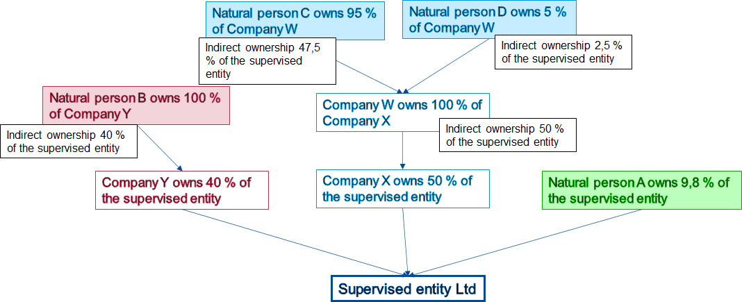Indirect ownership refers to a situation where control is exercised through another entity. A person may be the indirect owner of a supervised entity where, for example, company Y owns 40% of a supervised entity and the person owns 100% of company Y. In that case, the person is the indirect owner of the supervised entity and the indirect holding is 40%, which must be reported to the FIN-FSA as a holding exceeding the 30% limit. The size of the indirect holding is determined by multiplying the holdings in the ownership chain.
