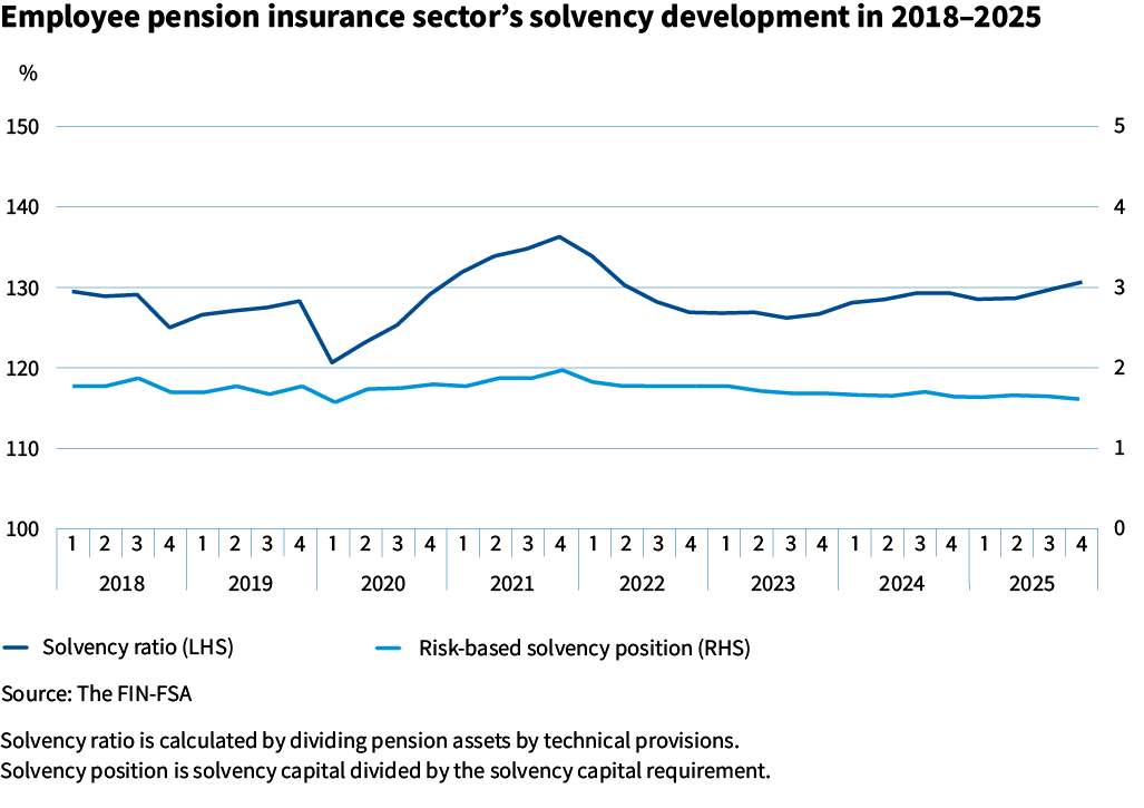 The solvency capital of the employee pension sector grew during the review year owing to positive investment returns (7.7%). The solvency ratio, which indicates the ratio of solvency capital to insurance liabilities, strengthened during the year as solvency capital grew faster than insurance liabilities.