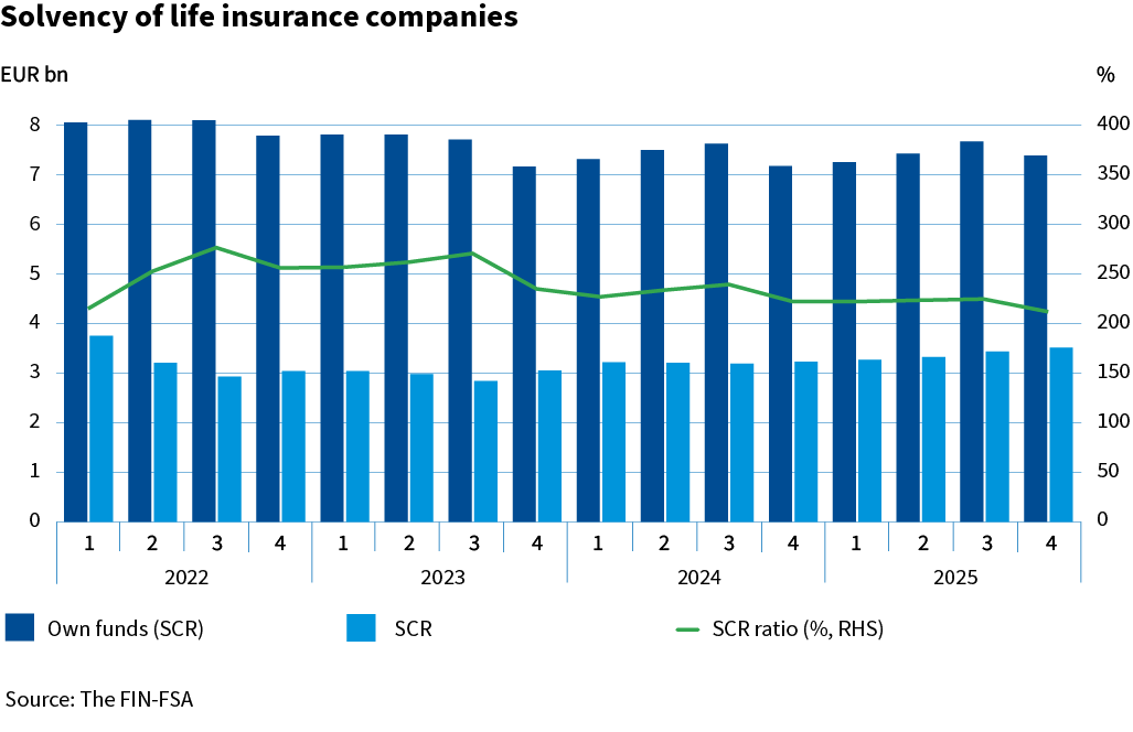 The solvency ratio of the life insurance sector declined during 2025 to 212.1% (12/2024: 222.4%), as the Solvency Capital Requirement (SCR) grew faster than own funds.