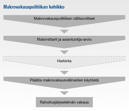 Makrovakauspolitiikasta päättää Finanssivalvonnan johtokunta. Toimenpidepäätösten perustana on perusteellinen asiantuntija-arvio, jonka keskeisenä tehtävänä on tunnistaa mahdolliset finanssijärjestelmän vakautta uhkaavat riskit mahdollisimman aikaisessa vaiheessa. Asiantuntija-arviota ohjaavat määrälliset riskimittarit, joiden on tutkimusten ja empiirisen kokemuksen perusteella todettu kuvaavan järjestelmäriskien muodostumista ja finanssisektorin tilaa. Suomessa asiantuntija-arvio laaditaan laajassa viranomaisyhteistyössä, johon osallistuvat Finanssivalvonnan lisäksi Suomen Pankki, valtiovarainministeriö ja sosiaali- ja terveysministeriö.