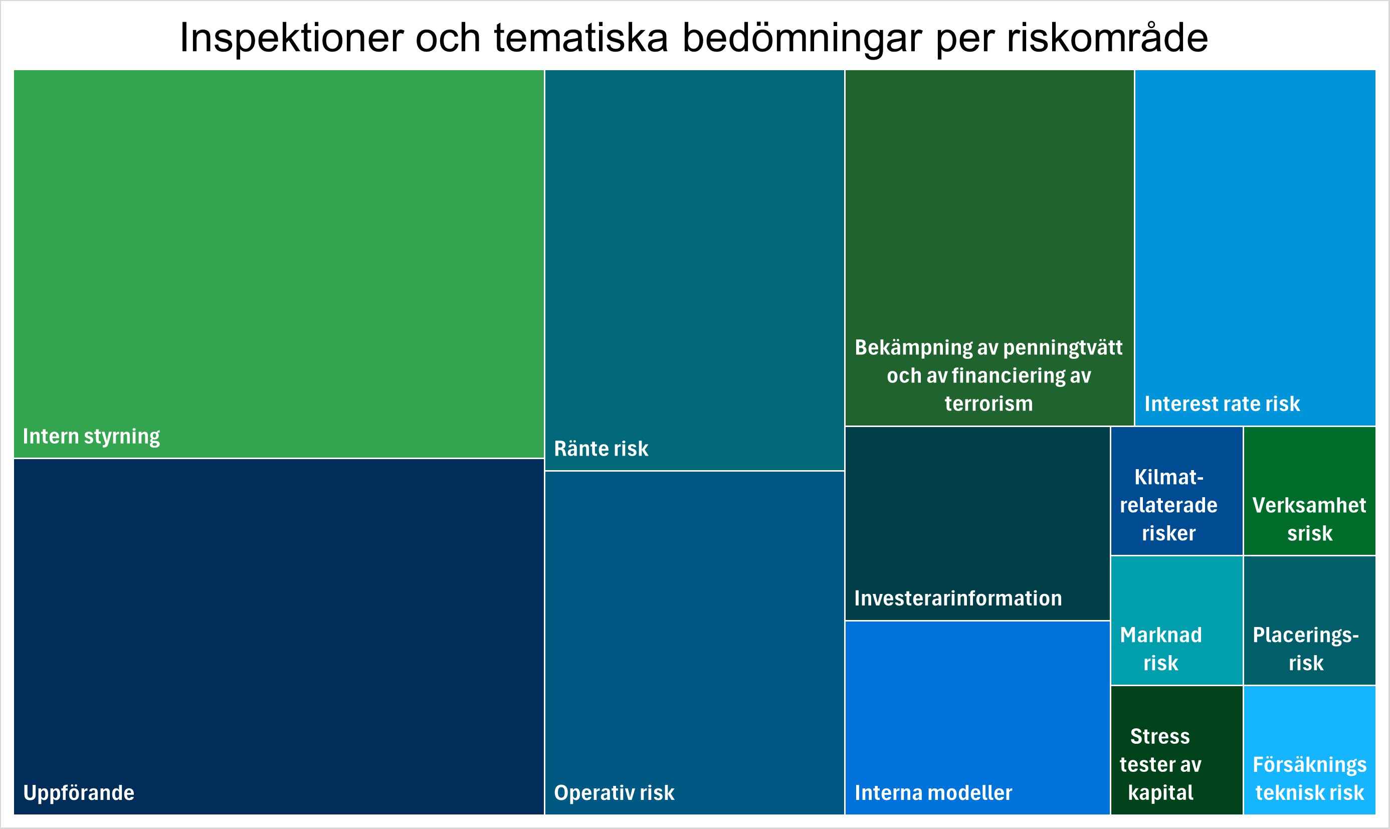 För 2026 har Finansinspektionen planlagt sammanlagt 35 nya inspektioner (2025: 33) och 24 nya tematiska bedömningar (2025:18Dessutom fortsätter 17 tillsynsåtgärder som inletts 2025. I antalet inspektioner ingår också inspektioner av banker under ECB:s direkta tillsyn som Finansinspektionen genomför tillsammans med ECB.