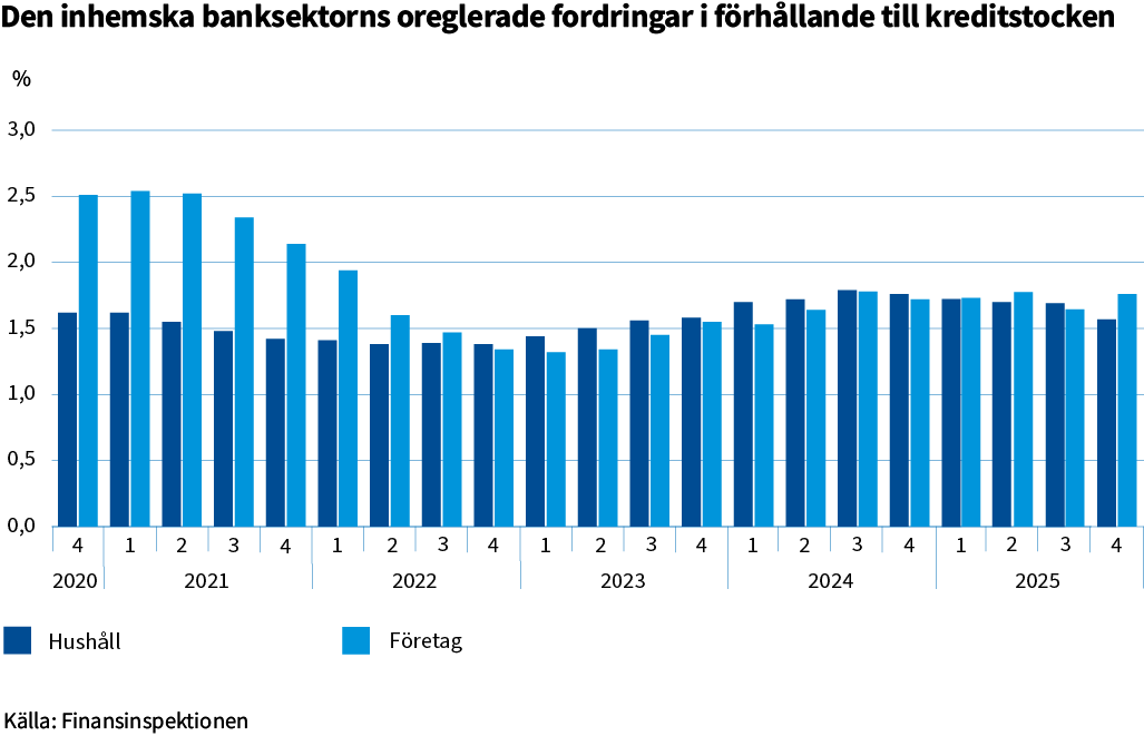 Banksektorns rörelseresultat minskade drivet av räntenettot som var lägre än under jämförelseåret. Räntenettot var fortfarande den mest betydande intäktsposten för finländska banker. Minskningen i räntenettot avtog dock mot årets slut. Resultatförsämringen till följd av det minskade räntenettot uppvägdes också av den positiva utvecklingen av nedskrivningar. Banksektorns oreglerade krediter var alltjämt låga och bland de lägsta i Europa. Andelen oreglerade fordringar inom hushållslån sjönk något under berättelseåret. Andelen oreglerade fordringar inom företagslån var däremot lite högre än året innan. Å andra sidan såg man mot slutet av berättelseåret i vissa företagslånsegment, såsom byggande, svaga tecken på en förbättring i kreditstockens kvalitet. De bankspecifika skillnaderna i kreditriskutvecklingen var dock stora.