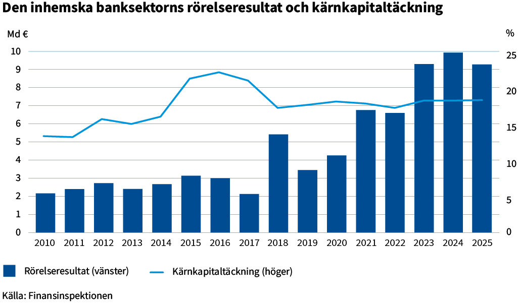 Trots återhämtningen i förtroendet och bättre ekonomiska utsikter är riskerna i den finansiella sektorn i Finland fortfarande höga till följd av den allmänna osäkerheten. De nedåtgående riskerna omfattar bland annat den fortsatta geopolitiska och handelspolitiska spänningen, den finländska ekonomins sämre utveckling än väntat, det sämre sysselsättningsläget, den fortsatta nedgången i fastighetspriser och avtagande handel. Om riskerna förverkligas kan de tillsammans med sårbarheterna i den finländska finansiella sektorn utlösa en ogynnsam negativ utveckling. Även ökningen i hybrid- och cyberattacker framhäver ytterligare vikten av beredskap för operativa risker och hanteringen av dem.