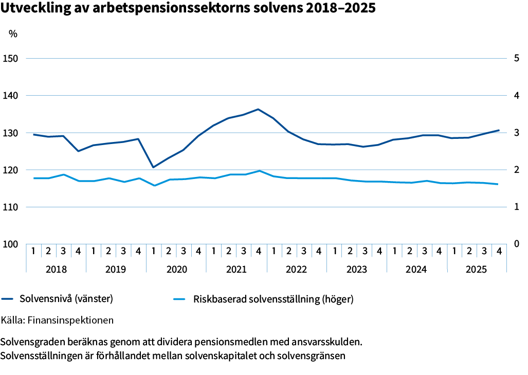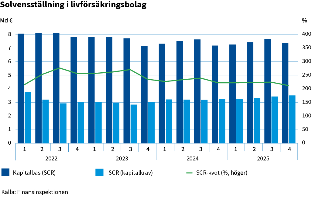 Livförsäkringssektorns solvensgrad sjönk under 2025 och låg på 212,1 procent (12/2024: 222,4 %) då solvenskapitalkravet (Solvency Capital Requirement, SCR) steg snabbare än kapitalbasen.