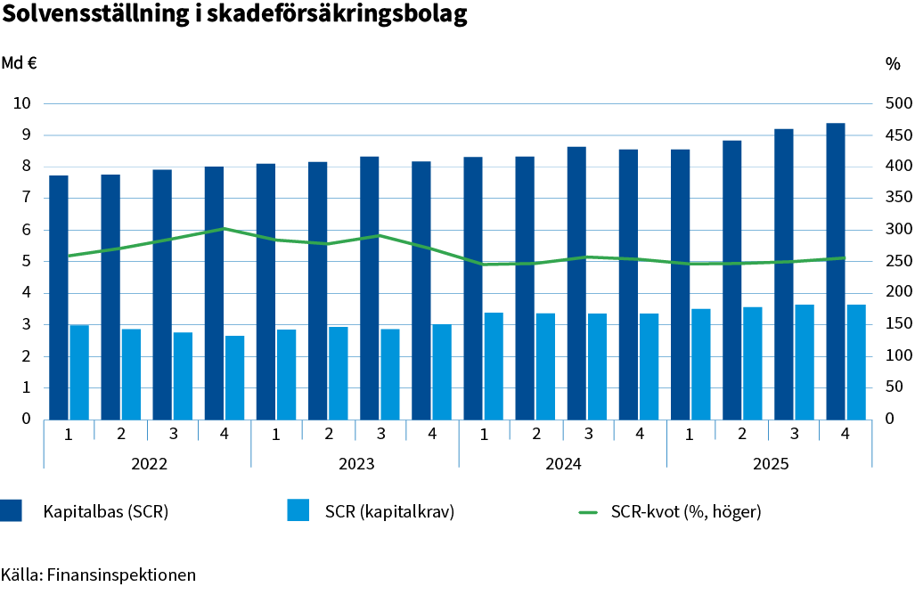 Skadeförsäkringssektorns solvensgrad låg vid slutet av berättelseåret på en god nivå, 256,5 procent, och var lite högre än under föregående år (12/2024: 254,4 %). Kapitalbasen ökade något snabbare än solvenskapitalkravet.