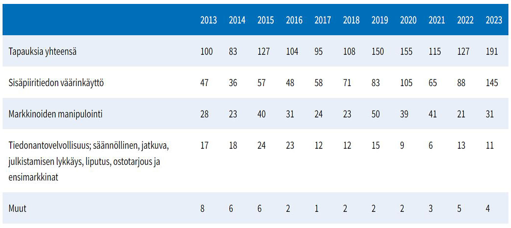 Taulukko 2. Finanssivalvonnan käsittelemät arvopaperimarkkinoiden kaupankäyntiin ja tiedonantovelvollisuuteen liittyvät valvontatapaukset 2013–2023