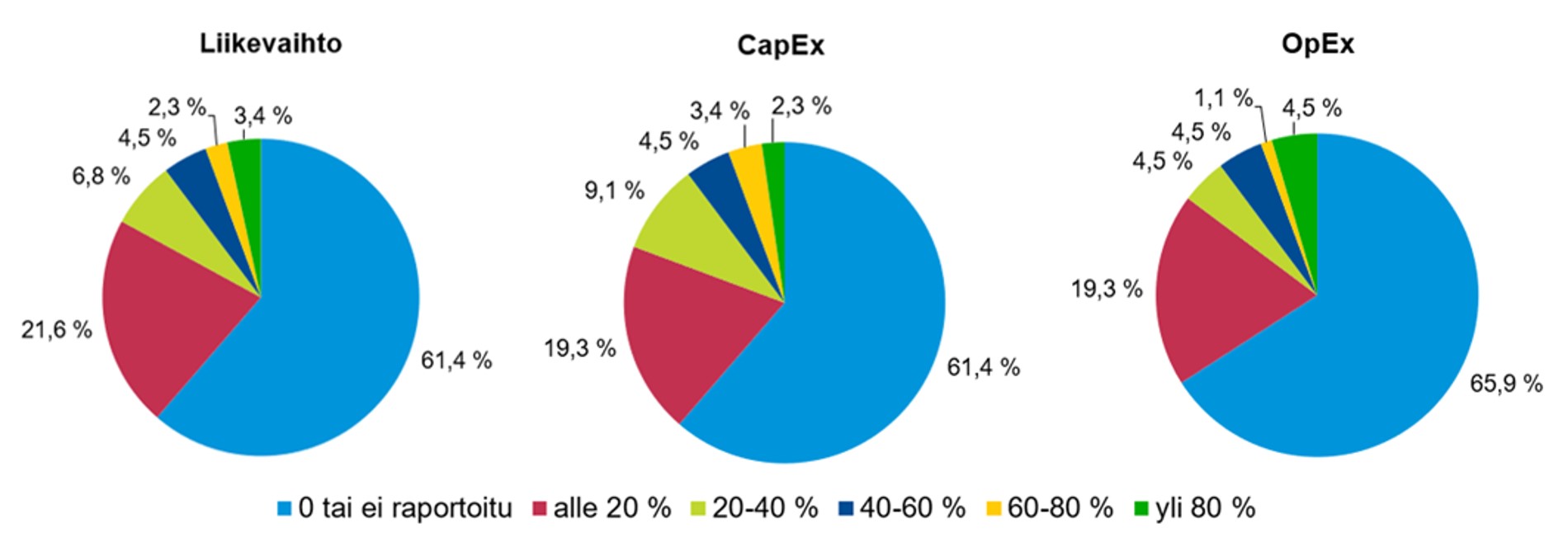 Niiden yhtiöiden osuus, jotka ovat raportoineet liikevaihto-, CapEx- tai OpEx-mittarin nollana tai mittaria ei ole raportoitu, on huomattavan korkea, toisin sanoen yli 60 prosenttia kaikkien mittareiden osalta. ESMAn eurooppalaisten yhtiöiden kartoituksessa vastaavan nollaraportoinnin osuudet olivat 24 % (liikevaihto), 15 % (CapEx) ja 30 % (OpEx).