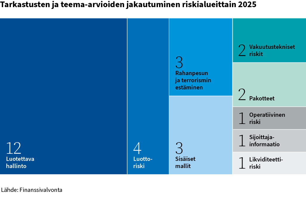 Finanssivalvonta keskittyi vuonna 2025 pankkien teema-arvioissa luottoriskiin ja luotonantoon liittyviin teemoihin. Tarkastuksissa keskityttiin näiden lisäksi hallinnon luotettavuuteen sekä sisäisten mallien käyttöön.